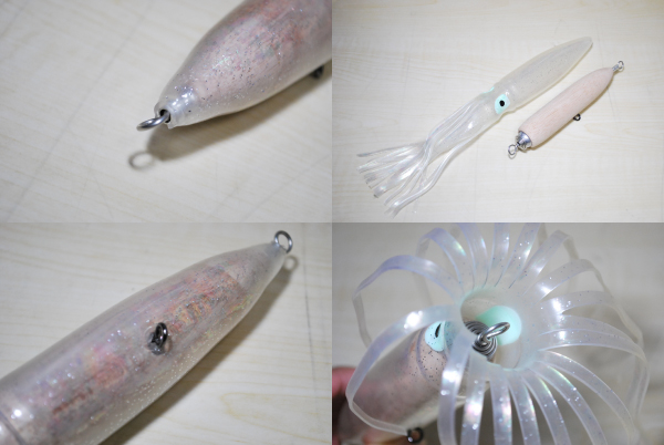 冬の玄界灘のマグロ狙いに欠かせないアイテムにイカルアーがあります。 そのイカパターンを攻略するイカルアーをしーまん工房で製作しています。 現在、手作業で作っていますので、数に限りがありますが、是非あなたも体験してみませんか。 スペック ●カラー 各色在庫状況で変わります。お問合せください。 写真のカラーはT-313 (半透明 一部グロー塗料) ●長さ 約30cm ●重さ フック無し:約110g フック込み:約130〜140g ●推奨フック フロント:ST66 3/0 リアST66 4/0 ●スローシンキング ●素材 構造物:ハードウッド(樫材) イカベイト:ヨーヅリ ヤリイカ10号 ●フックの重量で沈降速度を調節可能ですが、上記フックサイズが推奨です。 頑丈な材質で、大物マグロでもビクともしません。また、海水が染み込んでも耐久性は変わりません。 販売価格:4,500円(消費税別) |